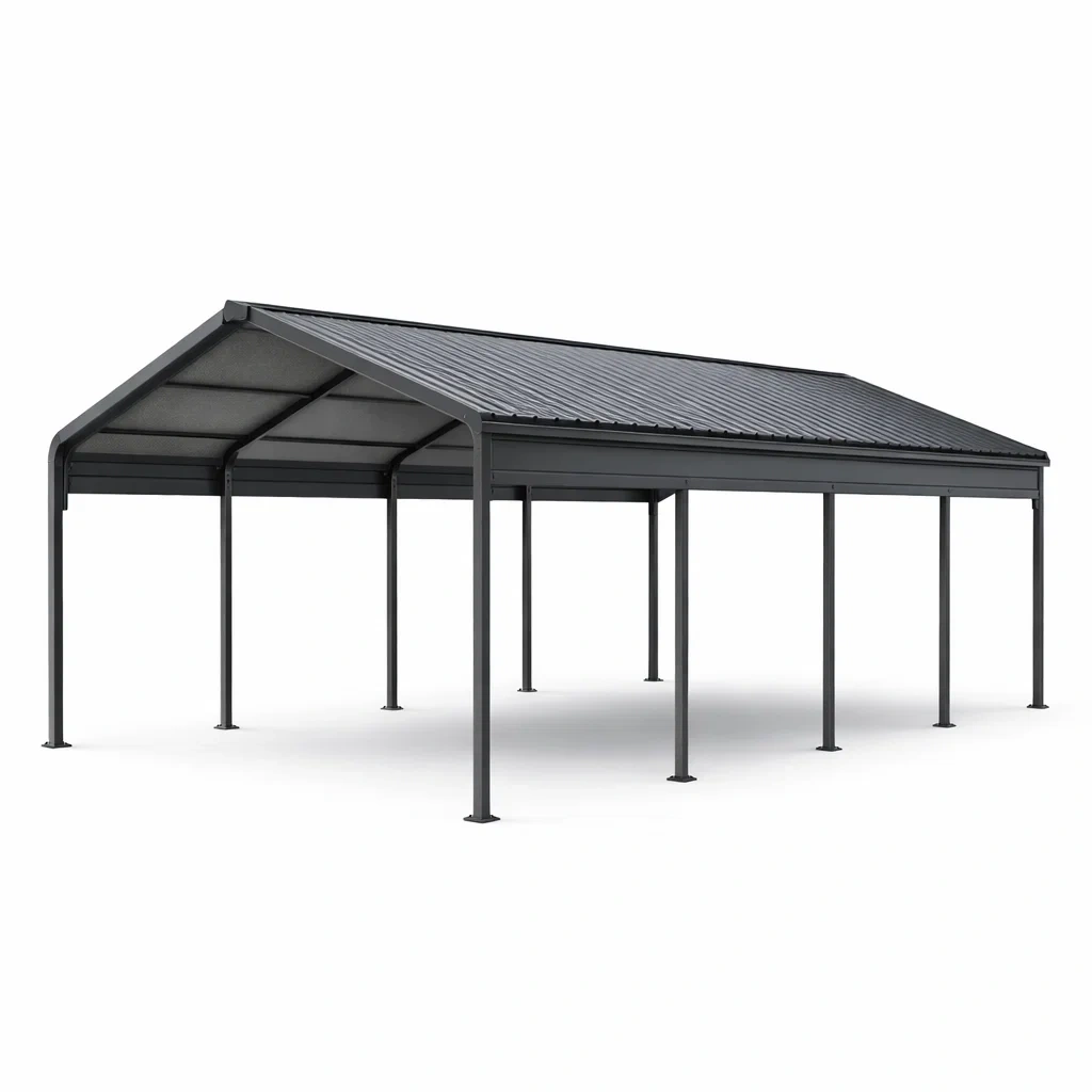 Questa tettoia ha una struttura in metallo zincato e un tetto in policarbonato resistente adatto per l'uso esterno. Le dimensioni sono 600 cm di lunghezza, 300 cm di larghezza e 230 cm di altezza.