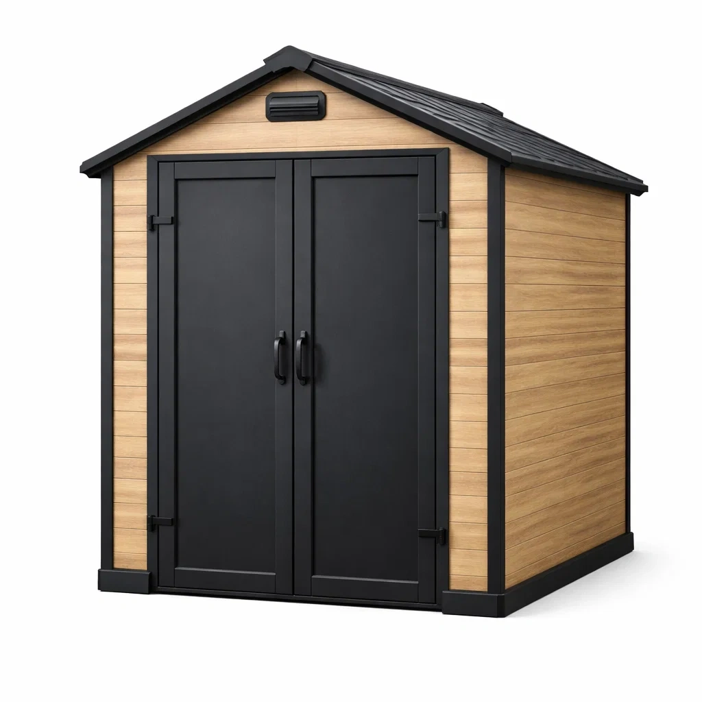 Il capanno da giardino ha dimensioni di 185 cm x 152 cm x 226 cm. La struttura è composta da pannelli in legno composito e una solida struttura in metallo. Colore Marrone e Nero, con un peso totale di 150 kg. È resistente agli agenti atmosferici e ha un alto livello di impermeabilità.