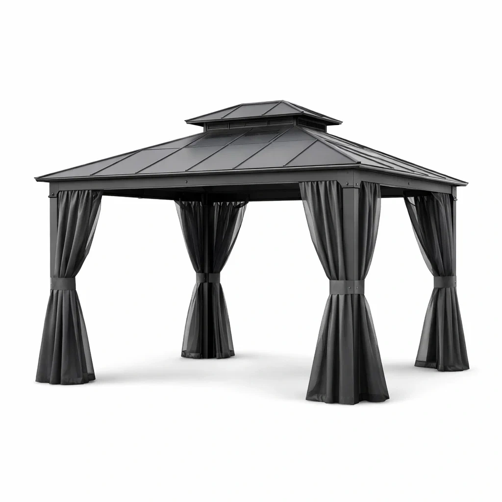 La struttura del gazebo è in alluminio resistente agli agenti atmosferici. Il tetto è in metallo per protezione dagli elementi. Le tende sono realizzate in poliestere facile da pulire.