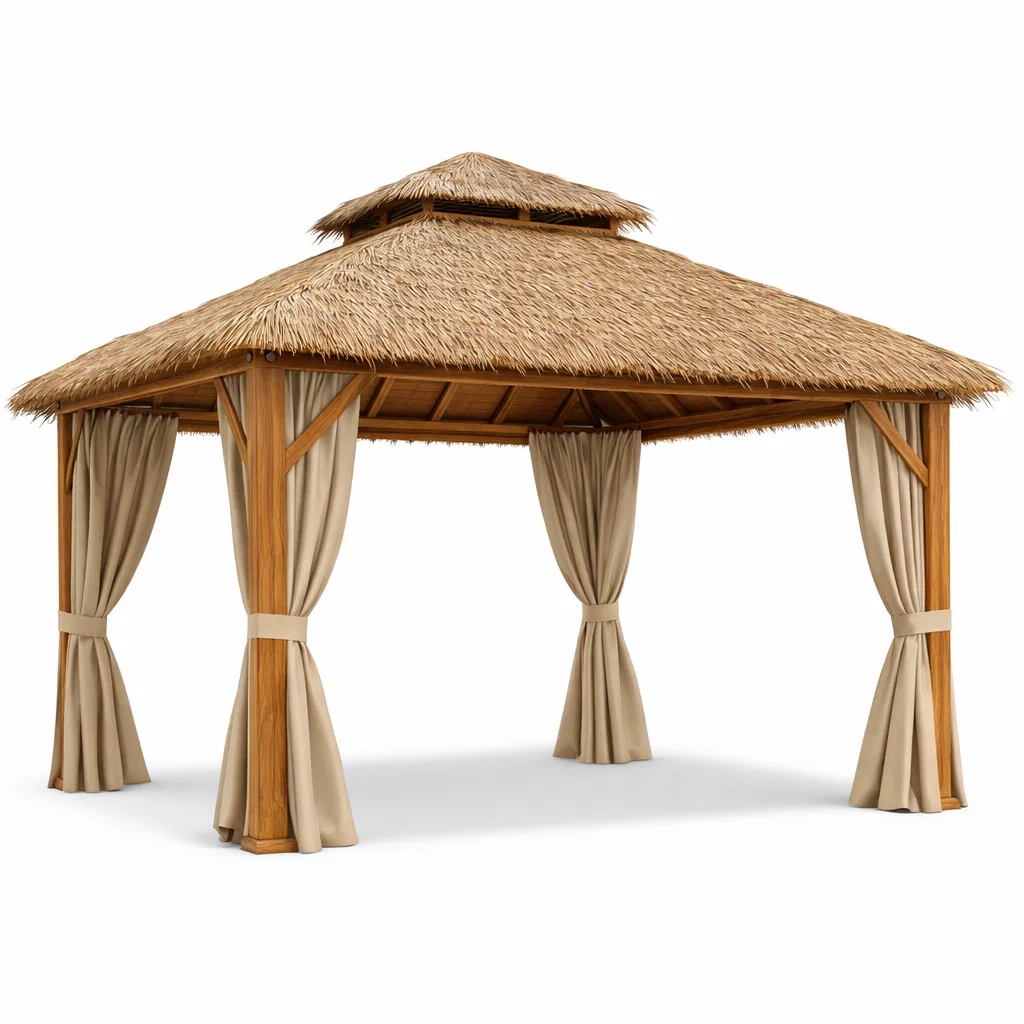 Gazebo in legno di pino con tetto in paglia sintetica e tende in poliestere