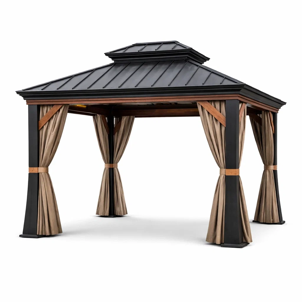Questo gazebo è dotato di una struttura realizzata in alluminio verniciato a polvere, garantendo robustezza e resistenza agli agenti atmosferici. Il tetto è composto da acciaio zincato, ideale per protezione dagli elementi esterni. Le tende sono in poliestere, offrendo una copertura leggera e resistente. Le dimensioni complessive sono 300 cm di lunghezza, 300 cm di larghezza e 300 cm di altezza. Il peso netto del gazebo è di 50 kg. Sono inclusi pali di supporto e un kit di montaggio per una facile installazione. Si consiglia la pulizia con acqua e sapone neutro, e di conservare il gazebo in luogo asciutto quando non in uso.