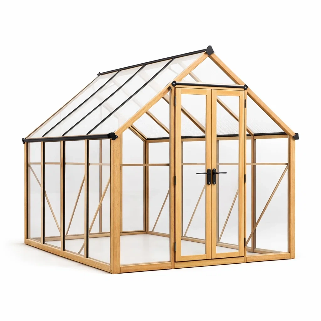 La serra è realizzata in legno massello con connettori in metallo resistente. Le dimensioni esterne sono 200x150x210 cm. Il colore della struttura è Legno Naturale, mentre i pannelli sono trasparenti e realizzati in vetro temperato con uno spessore di 4 mm.