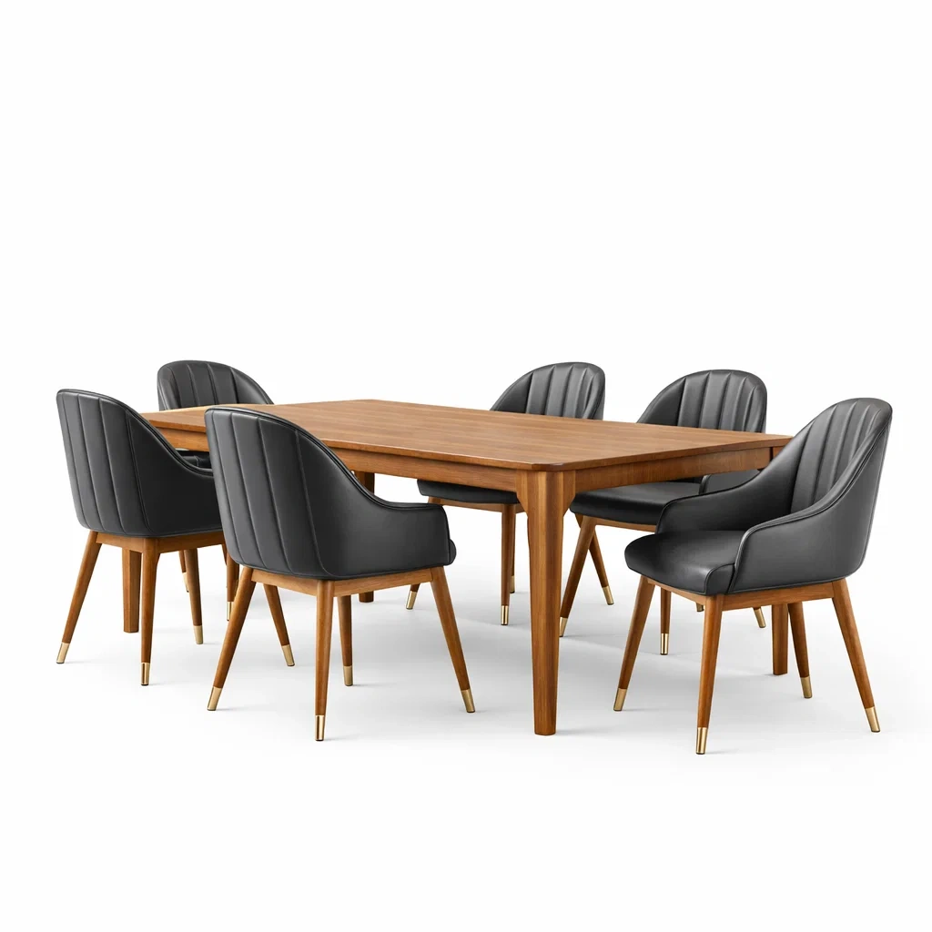 Set tavolo e sedie rettangolare in legno con 6 sedie in pelle nera